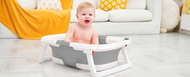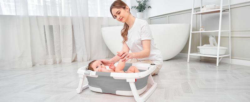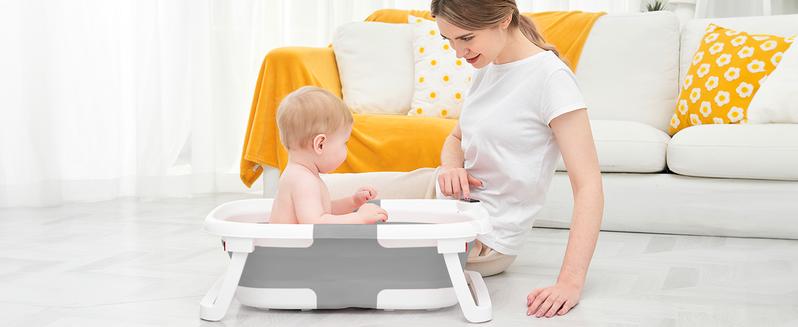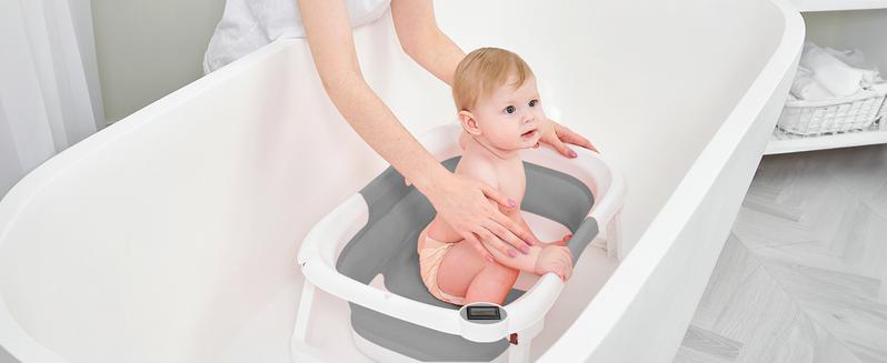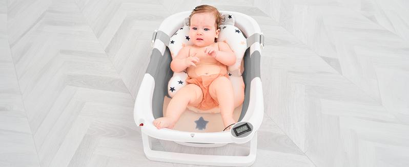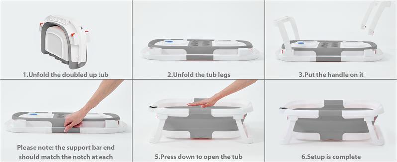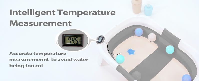 【Foldable design & Space Saving】 In three simplesteps, it can be folded down to a thickness of only 2inches. Easy storage without taking up space.Applicable Age】0-36 months .Please use it underthe care of an adult. Do not leave the baby alone toprevent drowning.【Visible Temperature】 Baby Bathtub is equippedwith a temperature sensor, convenient for parents toadjust the water temperature in time. Ensure the safetyand comfort of the baby when bathing.【Soft Cushion】 With soft spring cushion to protectbaby's spine from shocks, and the baby bath morecomfortable. Can float on the water surface of the bathso that the baby does not cry or make trouble.【High Quality Material】 Baby Bathtub is made ofPP+TPE environmentally friendly materials, non-toxicsubstances.lt is the safest material for babies, pleaseuse it with confidence.【Drainage Hole Design】 The bathtub is equippedwith a drainage hole, allowing for easy water drainageand preventing water accumulation, ensuring a clean andhygienic bathtub. This design makes the bathing processmore convenient and effortless.【Detachable Feet】With our upgrades; the two legsof this bath tub are removable. So you need to removethe two feet when folding. Folding method: First stepremove the bridge in the center -- Then Remove the feet-- Finally foldingPlease Note : Please dry in a ventilated place in timeafter use, but do not expose to the sun -
