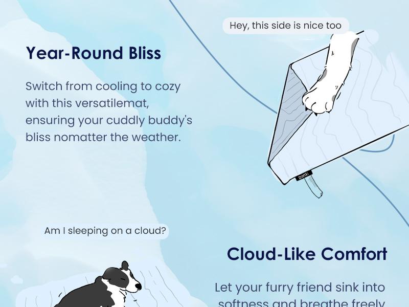 FAQI. Product Composition & Design1. What is the cooling fabric of the Zonli Pet Cooling Matmade of?The surface is crafted from 100% nylon with advancedArc-Chill cooling technology, delivering instant coolingfor your pet. No water, air conditioning, or refrigerationneeded-just lay it out and let the magic happen!2. How thick is the Zonli Pet Cooling Mat?The mat is 1 inch thick, filled with high-density syntheticfiber that provides exceptional support and comfort foryour pet.3. Why is the Zonli Pet Cooling Mat comfortable?The mat's cooling top layer keeps your pet cool, while thesoft, breathable middle layer of synthetic fibers offers afluffy, airy feel. The high-density base provides excellentsupport and pressure relief, ensuring a comfortable rest.It's perfect for pets that need a fluffy plush experienceespecially during indoor use.4. Is the Zonli Pet Cooling Mat non-slip?The plush side is designed to provide a natural grip andhelp reduce sliding. For extra stability on smoothsurfaces, or for larger or more active pets, placing a non-slip bottom mat underneath can be a great addition.ll. Performance & Cooling Technology5. How well does the cooling effect work?Our cooling fabric has a Q-MAX rating of >0.4, meaningit can lower surface temperatures by 4-6. 9oF uponcontact. For even better cooling, pair it with an air-conditioned or fan-cooled room. lt's a perfect coolingpad for pet water beds on hot days.6. Can l use the Zonli Pet Cooling Mat in the winter?Yes! The mat is dual-sided one side features coolingfabric for hot days, while the other side is made of softplush to provide extra warmth during colder months.III. Usage & Maintenance7. Can the Zonli Pet Cooling Mat be machine-washed andput in the dryer?Yes! You can machine-wash it on a gentle cycle andtumble dry on low or air-dry to help maintain its coolingperformance and extend its lifespan.8. Does the Zonli Pet Cooling Mat have a bad smell?No, it doesn't! The mat is OEKO-TEX certified, meaningit's free from harmful substances and odors. lf your pet issensitive to new items, you can air it out before use.9. How long does the Zonli Pet Cooling Mat last?With proper care, your Zonli Pet Cooling Mat can last foryears. lt's designed for durability and longevity, built towithstand everyday use.10. ls the Zonli Pet Cooling Mat waterproof?This mat is not waterproof. lf you're looking forwaterproof protection, check out our specially designedoutdoor option.11. Can l use the Zonli Pet Cooling Mat outdoors?Yes! The mat is lightweight (0.44-2.87 lbs) and foldable,making it easy to carry and store wherever you go. lf youneed waterproof protection for outdoor use, consider ouroutdoor option. -