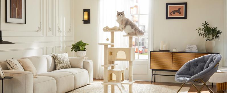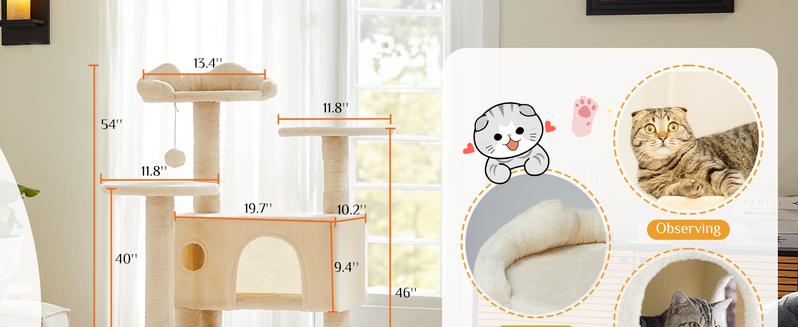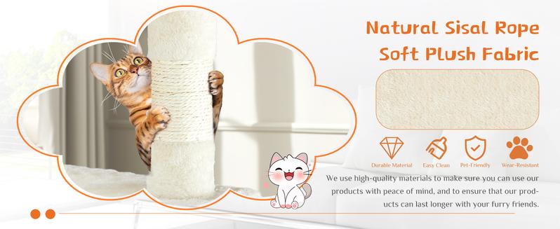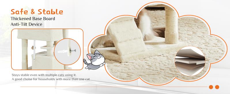 We only use pet-friendlymaterials for better products. The cat tower is covered inthick, plush fabric to keep your furry friends warm andcomfortable. The scratching posts are wrapped in naturalsisal rope, ensuring safety and durability. And toguarantee stability, the base board is reinforced withmultiple layers of thick material.【Stable & Space Saving】