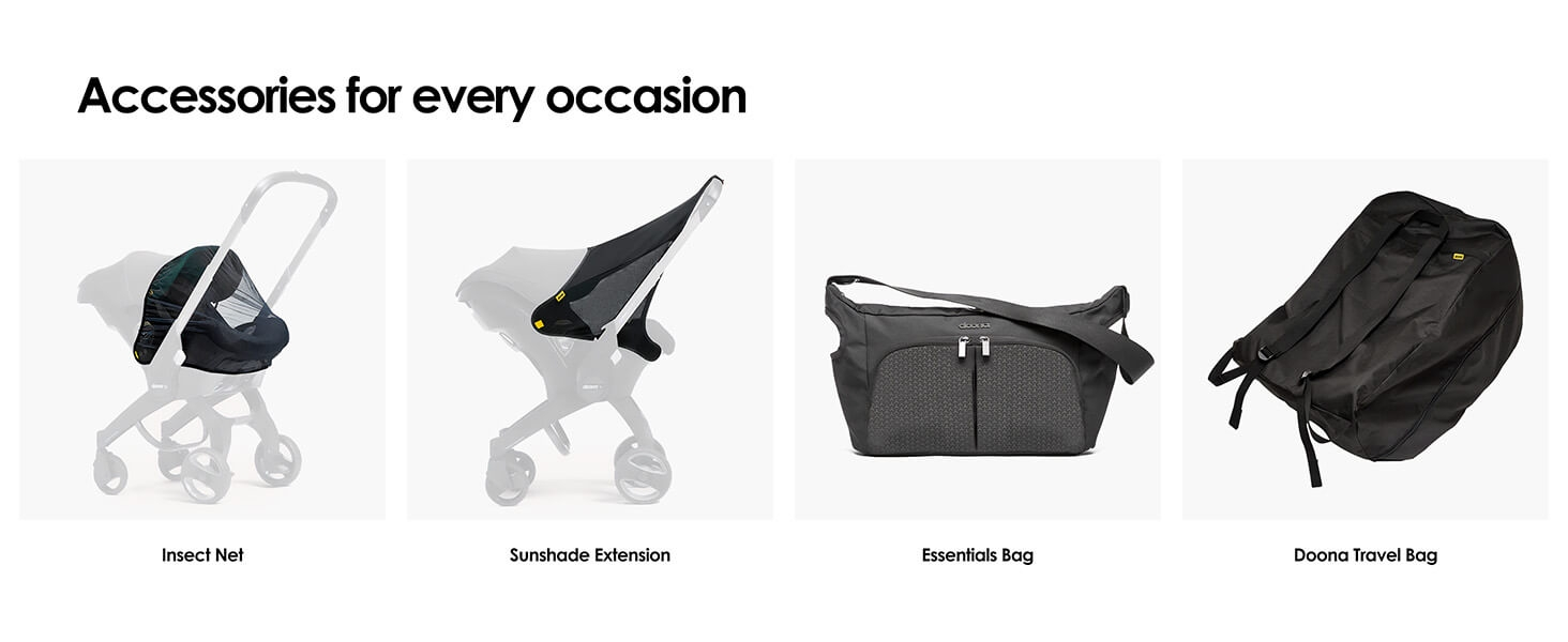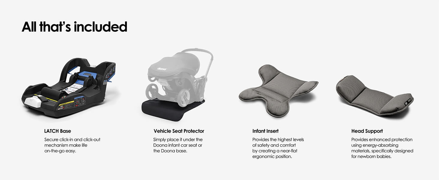- WHAT'S INCLUDED - The Doona Car Seat & Stroller includes the Doona Car Seat. the Doona Stroller. the Doona Infant Insert and Head Support. the Doona Vehicle Seat Protector. and the Doona LATCH Car Seat Base.