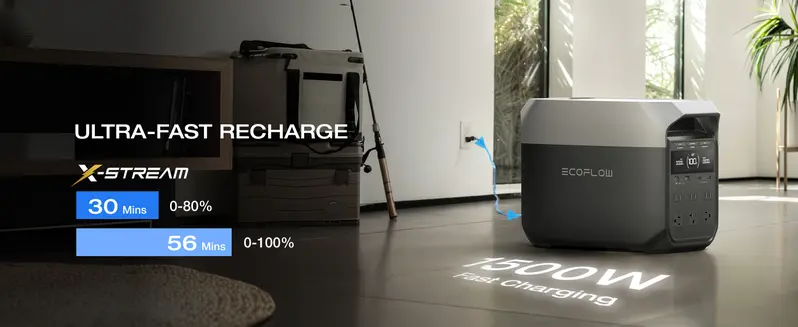 Full Charge in 56 Min. With DELTA3's upgradedtechnology combining 500W solar input and 1500W maxAC input, a full charge is achieved in 56 minutes. An 80%charge can be reached in just 30 minutes