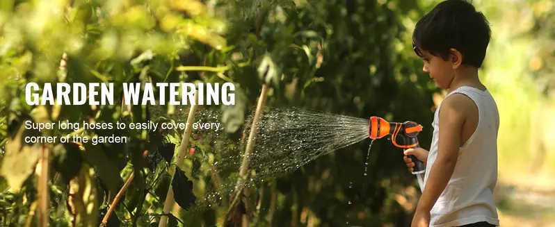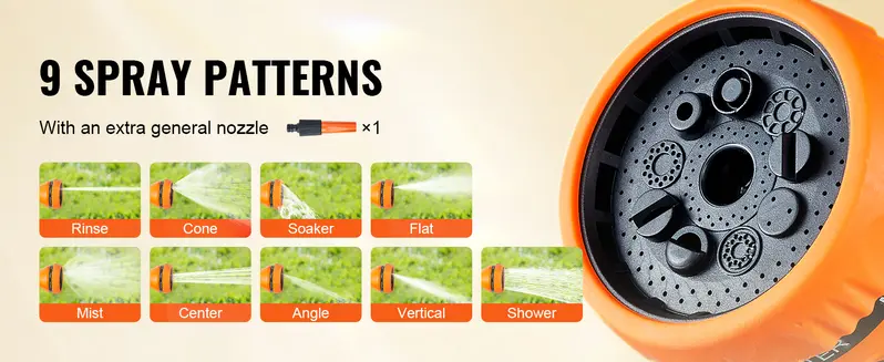 Wide Application: Make the most out of every spray,and choose how you spray. Our retractable garden hosereel comes with a 9-pattern hose nozzle (jet, soakerangle, flat, cone, shower, center, rinse, mist) and ageneral nozzle.lt is ideal for watering your lawn andgarden, washing your car, bathing your pet, cleaningdoors and windows, etc.